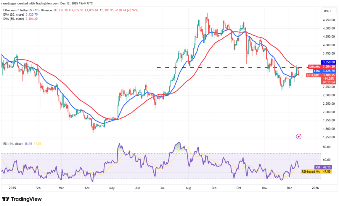 Ether (ETH) đã quay đầu giảm từ mốc 3.350 USD vào thứ Năm, và phe gấu đang nỗ lực duy trì giá dưới đường trung bình động hàm mũ (EMA) 20 ngày tại 3.125 USD.