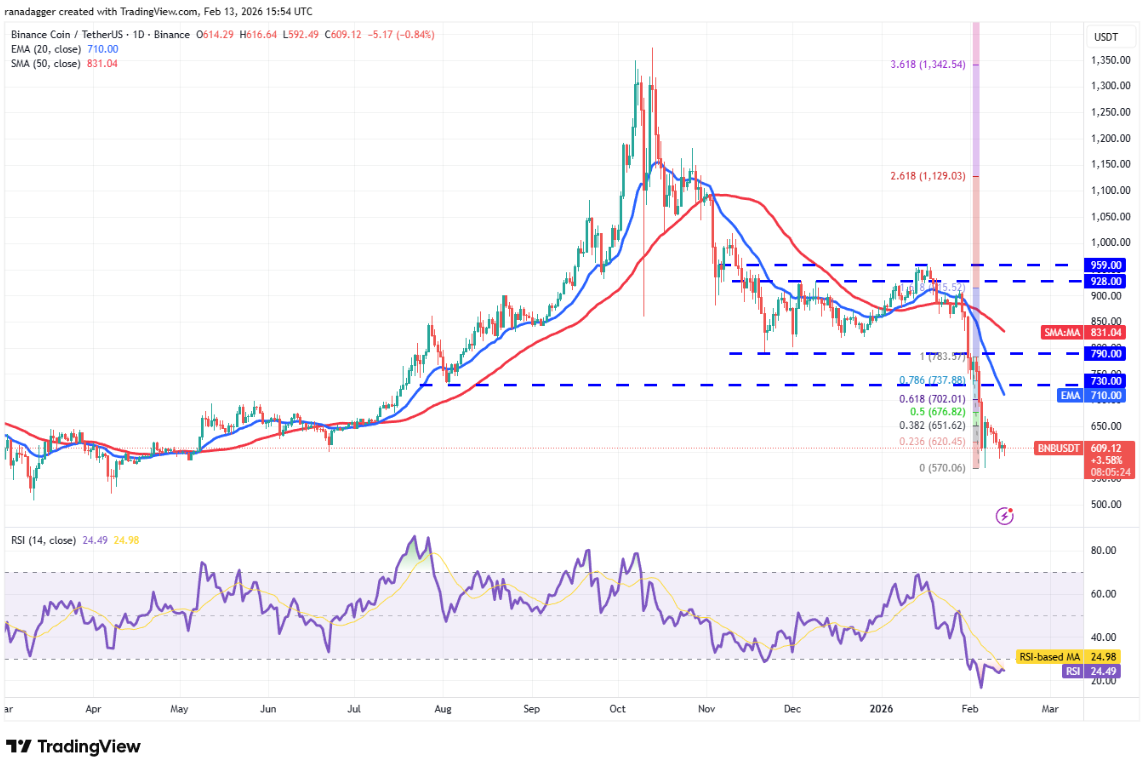 Tuy nhiên, chỉ số RSI đang nằm trong vùng quá bán, cho thấy khả năng xuất hiện một nhịp hồi kỹ thuật trong ngắn hạn. Nếu giá bật tăng từ vùng hiện tại, phe bò sẽ cố gắng đẩy cặp BNB/USDT vượt mốc 669 USD. Nếu thành công, giá có thể tiến tới đường EMA 20 ngày tại 710 USD.