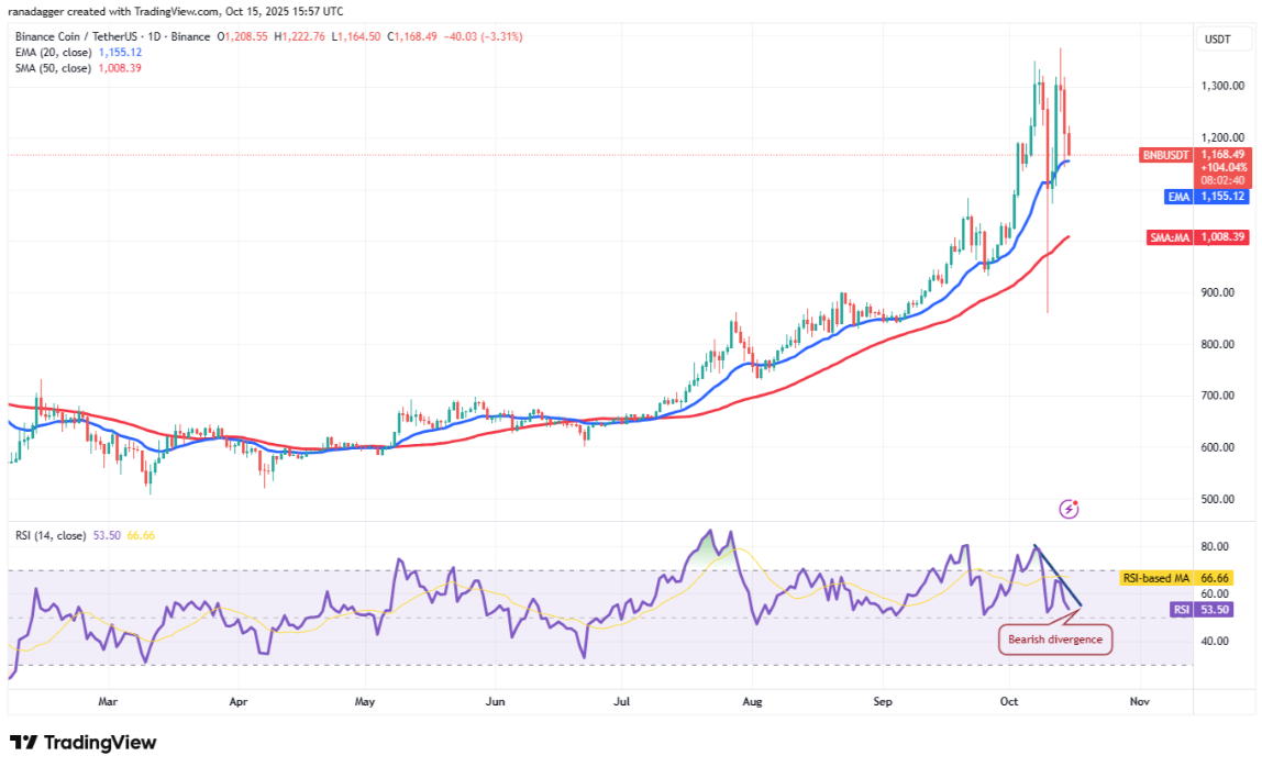 BNB đã không thể giữ vững trên vùng 1.350 USD vào thứ Hai, khiến nhà đầu tư ngắn hạn chốt lời, kéo giá giảm về đường EMA 20 ngày (1.155 USD) vào thứ Ba.