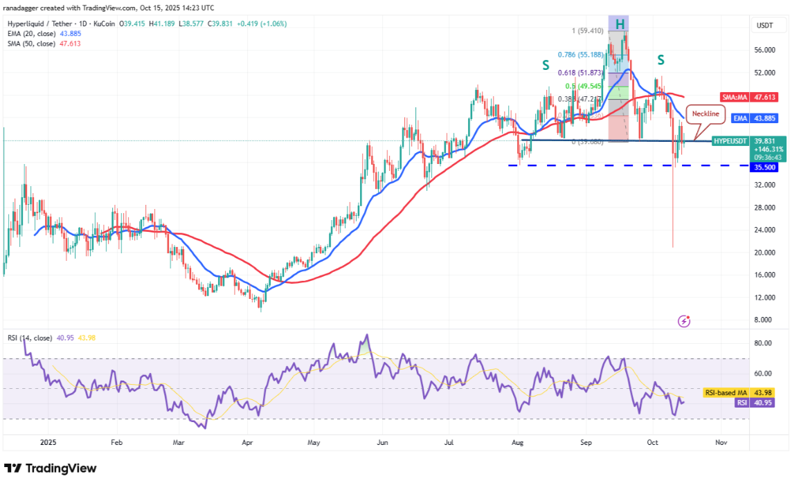 Hyperliquid (HYPE) quay đầu giảm từ đường EMA 20 ngày ở 43,88 USD vào ngày thứ Ba, cho thấy mỗi nhịp hồi đều đang bị bán xuống.