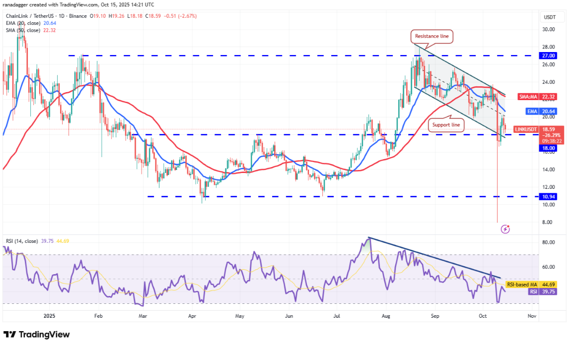 Biến động giá trong phạm vi này nhiều khả năng sẽ ngẫu nhiên và biến động mạnh. Đường trung bình động hàm mũ (EMA) 20 ngày đang dốc xuống, cùng chỉ số RSI quanh mốc 40, cho thấy phe gấu đang nắm lợi thế nhẹ. Nếu giá quay đầu giảm và phá vỡ mốc 0,18 USD, cặp DOGE/USDT có thể rơi xuống 0,16 USD. Dự kiến, phe bò sẽ phòng thủ mạnh ở vùng 0,14 – 0,16 USD.