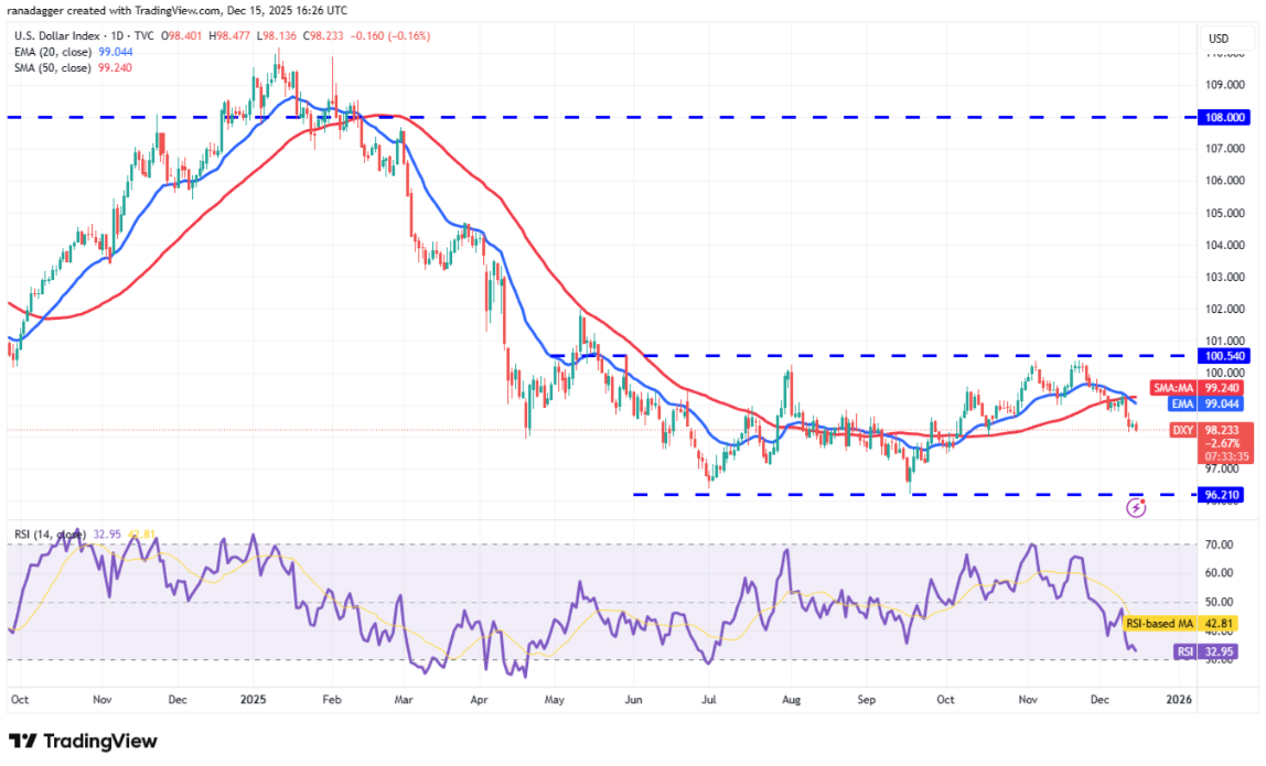 Các đường trung bình động đã hoàn tất giao cắt giảm giá, trong khi chỉ số sức mạnh tương đối (RSI) nằm trong vùng tiêu cực, cho thấy phe gấu đang chiếm ưu thế trong ngắn hạn. Mốc 98 đóng vai trò hỗ trợ nhỏ, nhưng nếu người bán kéo giá xuống dưới mức này, chỉ số có thể giảm về 97,20 và sau đó là 96,21.
