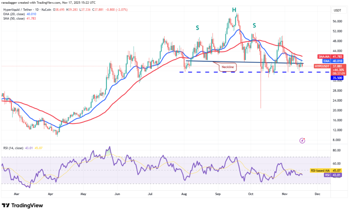 Hyperliquid (HYPE) đã dao động trong vùng hẹp giữa đường SMA 50 ngày (41,78 USD) và hỗ trợ 35,50 USD trong nhiều ngày qua .