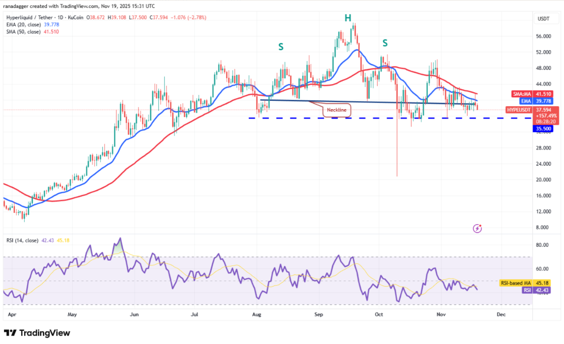 Giá sau đó quay đầu giảm và phe gấu đang nỗ lực kéo cặp HYPE/USDT xuống dưới hỗ trợ 35,50 USD. Nếu phá vỡ thành công, đà bán có thể tăng tốc và giá Hyperliquid có nguy cơ lao về 28 USD.