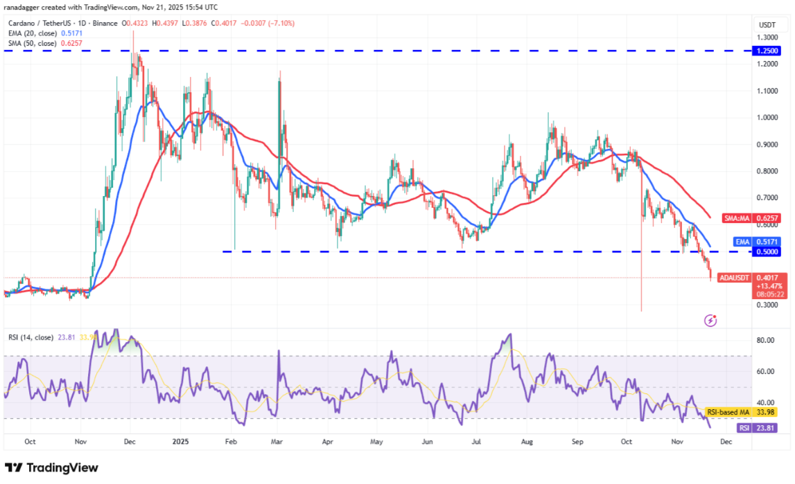 Đà giảm mạnh đã kéo RSI xuống vùng quá bán, cho thấy khả năng phục hồi có thể đang đến gần. Tuy nhiên, nhịp hồi phục dự kiến sẽ đối mặt với áp lực bán tại vùng phá vỡ 0,50 USD. Nếu giá Cardano quay đầu giảm từ 0,50 USD, điều đó cho thấy phe gấu đã biến vùng này thành kháng cự — qua đó làm gia tăng rủi ro giảm sâu về 0,27 USD.