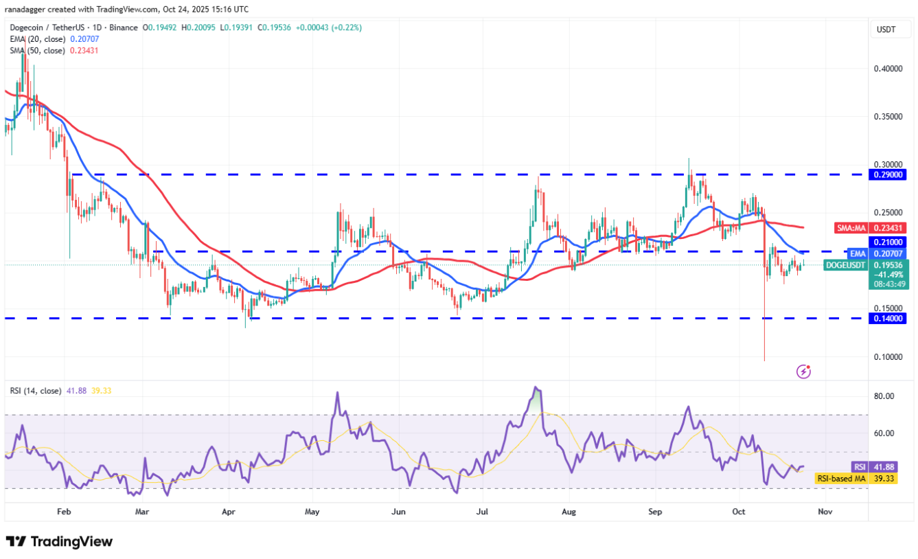 Dogecoin (DOGE) vẫn mắc kẹt dưới ngưỡng 0,21 USD, nhưng phe gấu cũng chưa thể giữ giá dưới 0,18 USD.