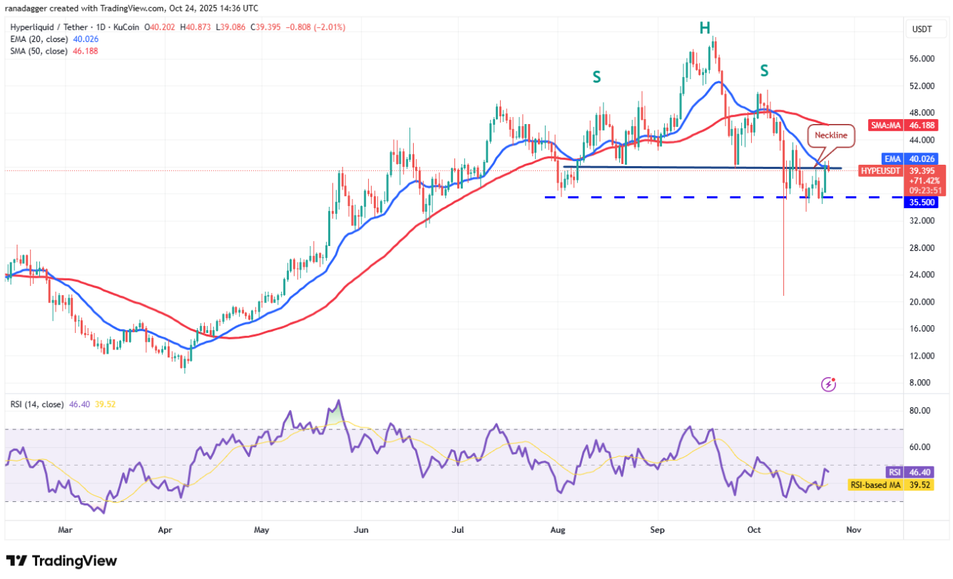 Phe bò hiện đang cố gắng củng cố vị thế bằng cách đẩy giá vượt đường EMA 20 ngày (40,02 USD). Nếu thành công, cặp HYPE/USDT có thể tăng lên đường SMA 50 ngày (46,18 USD).