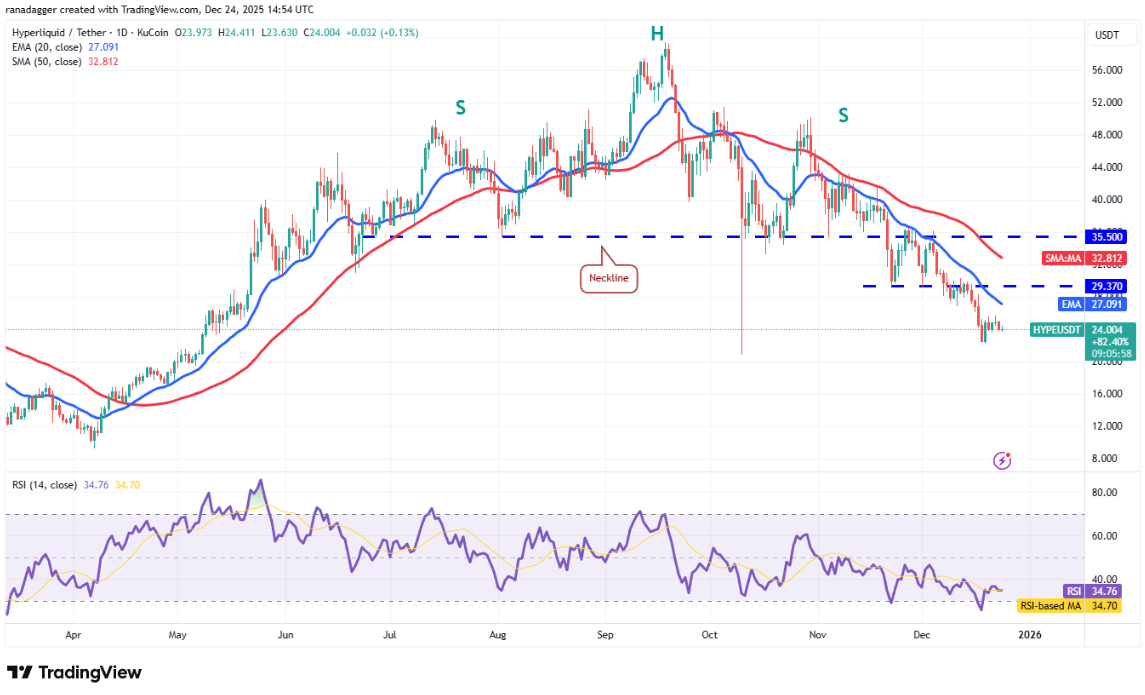 Đà bật tăng của Hyperliquid (HYPE) thậm chí còn không thể chạm tới đường EMA 20 ngày (27,09 USD), cho thấy nhu cầu mua từ phe bò ở các mức giá cao đang rất yếu.