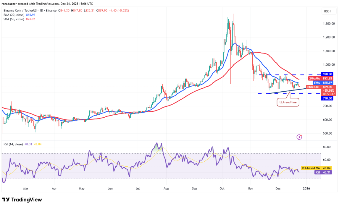 BNB đã quay đầu giảm từ đường EMA 20 ngày tại 865 USD vào thứ Hai, cho thấy áp lực bán xuất hiện ngay cả trong các nhịp hồi ngắn.