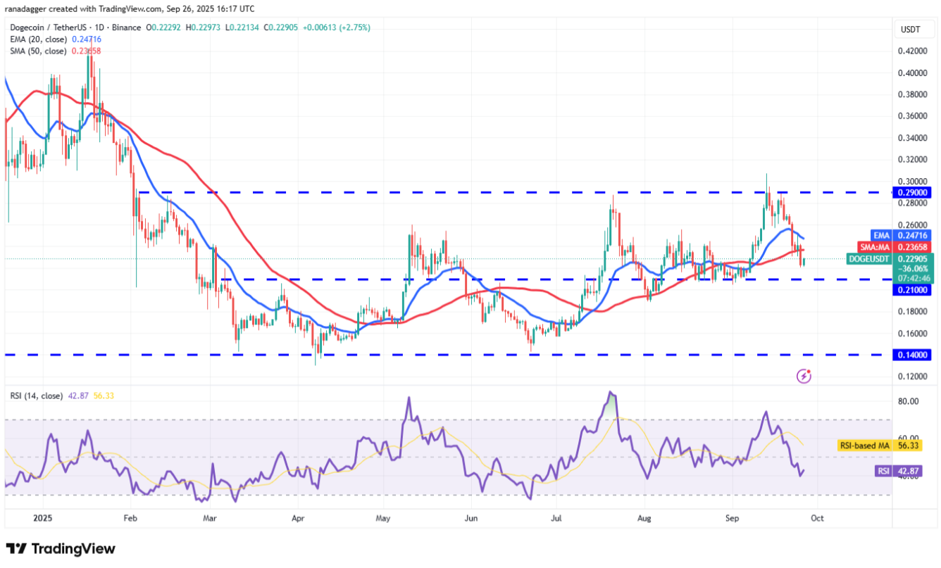 Việc phe bò không thể đẩy Dogecoin (DOGE) lên trên đường EMA 20 ngày (0,24 USD) hôm 25/9 cho thấy phe gấu vẫn đang bán mạnh khi giá hồi.
