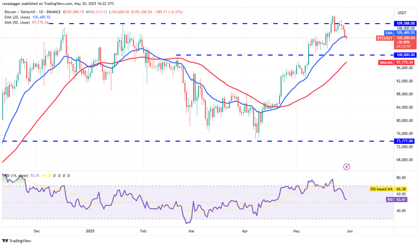 Bitcoin đã giảm về đường trung bình động hàm mũ (EMA) 20 ngày ở $105.485, nơi có khả năng diễn ra một cuộc giằng co quyết liệt giữa phe bò và phe gấu.