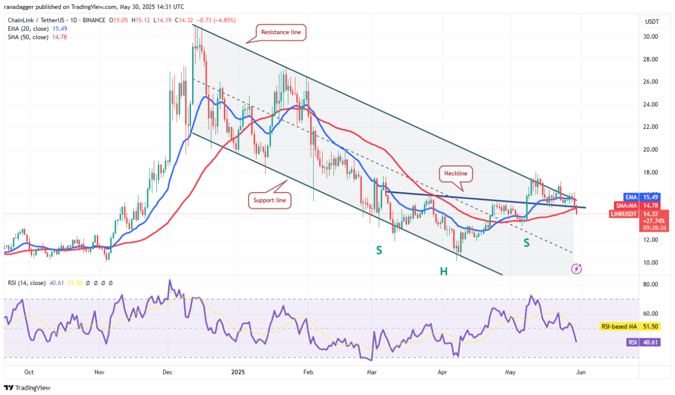 Phe gấu đang nỗ lực kéo giá xuống dưới đường viền cổ của mô hình vai đầu vai ngược. Nếu họ thành công, điều đó cho thấy thị trường đã bác bỏ mô hình tăng giá trước đó. Khi đó, cặp LINK/USDT có thể giảm về $13,20 và tiếp tục di chuyển trong mô hình kênh giảm thêm một thời gian nữa.