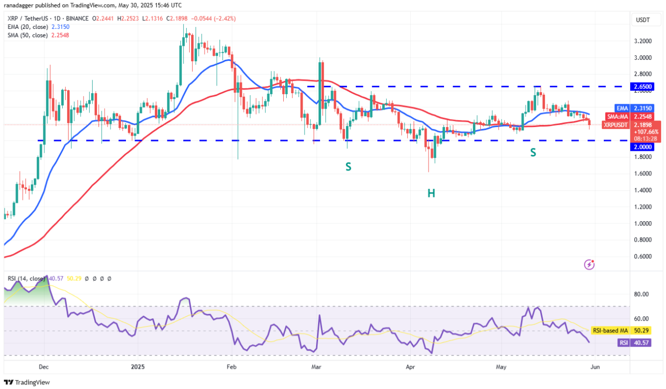 XRP đã giảm xuống dưới đường SMA 50 ngày ($2,25) vào ngày 30/5, cho thấy phe gấu đang chiếm ưu thế.