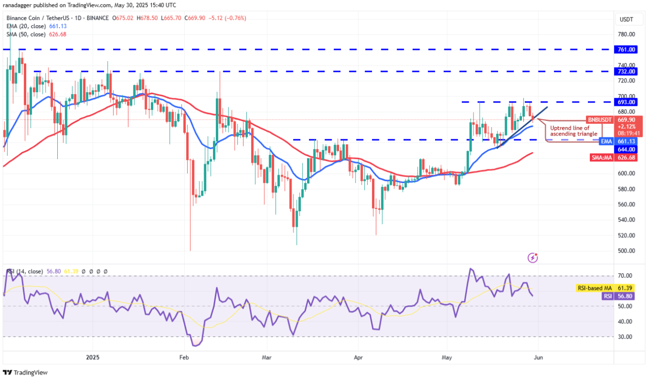 Phe bò đã không thể đưa giá BNB vượt qua ngưỡng kháng cự $693 vào ngày 29/5, dẫn đến một đợt điều chỉnh về đường xu hướng tăng.