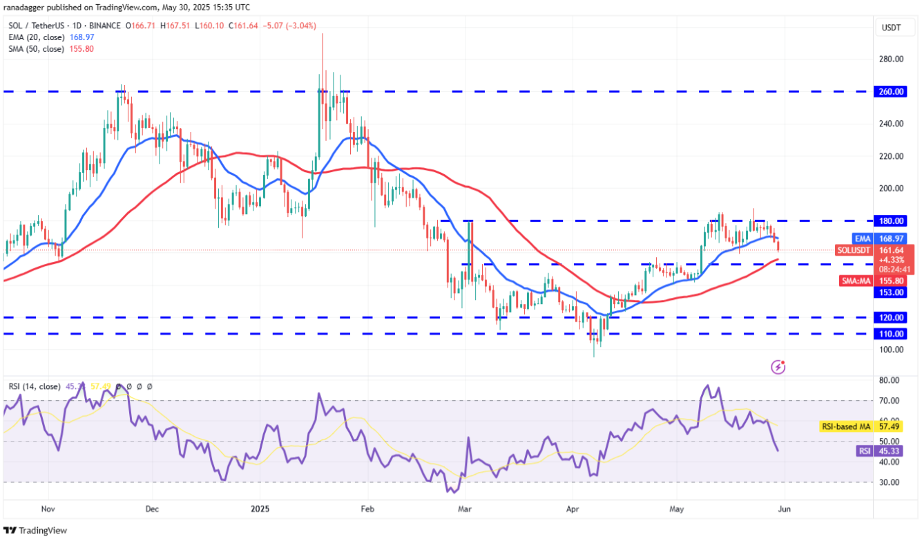 Solana (SOL) đã phá vỡ xuống dưới đường EMA 20 ngày ($168) vào ngày 29/5, cho thấy hoạt động chốt lời từ các nhà đầu tư ngắn hạn.