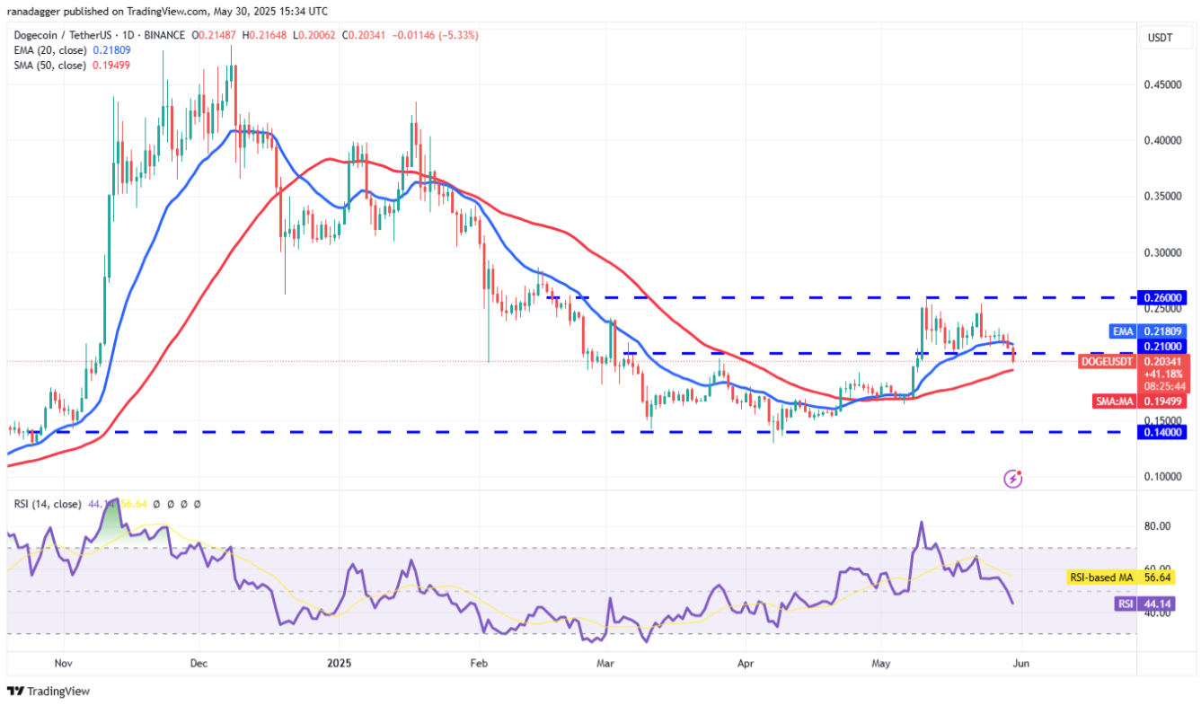 Dogecoin (DOGE) đã giảm mạnh xuống dưới mức hỗ trợ $0,21 vào ngày 30/5, đưa vùng dao động lớn từ $0,26 đến $0,14 trở lại cuộc chơi.