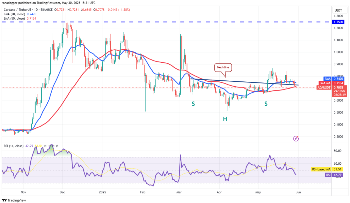 Cardano (ADA) đã giảm xuống dưới đường viền cổ của mô hình vai đầu vai ngược vào ngày 29/5, và phe gấu tiếp tục kéo giá xuống dưới đường trung bình động đơn giản (SMA) 50 ngày ở mức $0,71 vào ngày 30/5.