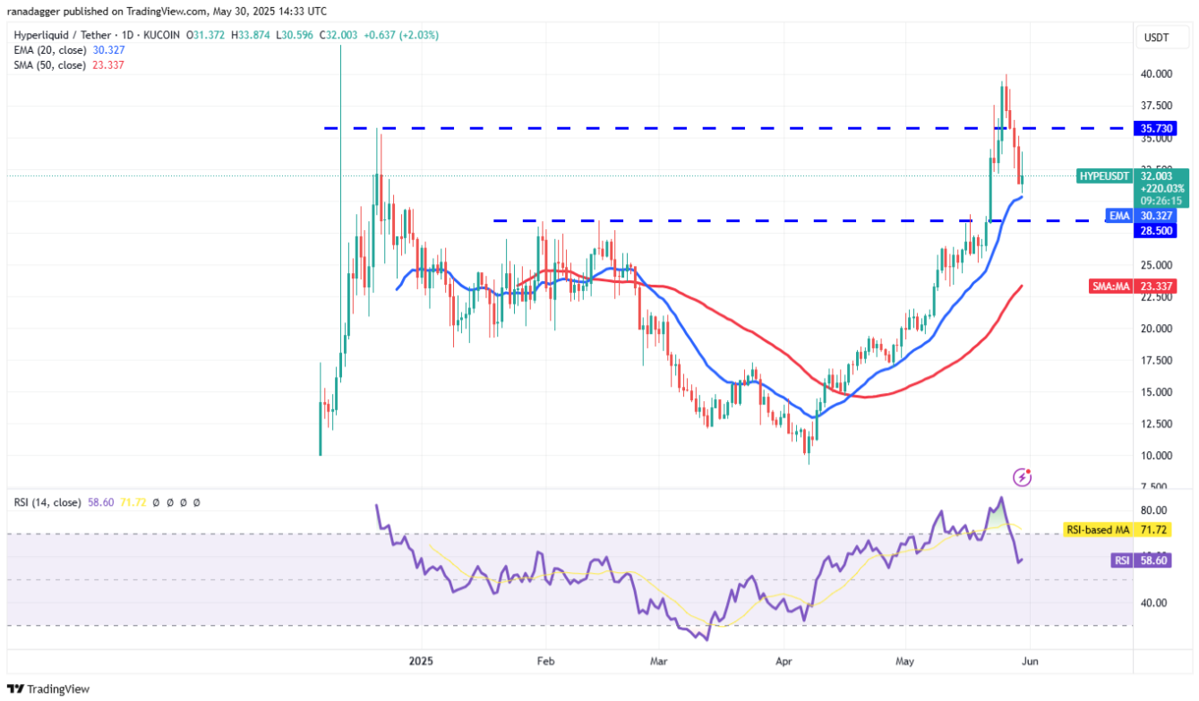 Hyperliquid (HYPE) đang cố gắng bật lên từ đường EMA 20 ngày ($30,32), tuy nhiên bóng nến dài cho thấy áp lực bán khi giá tăng.
