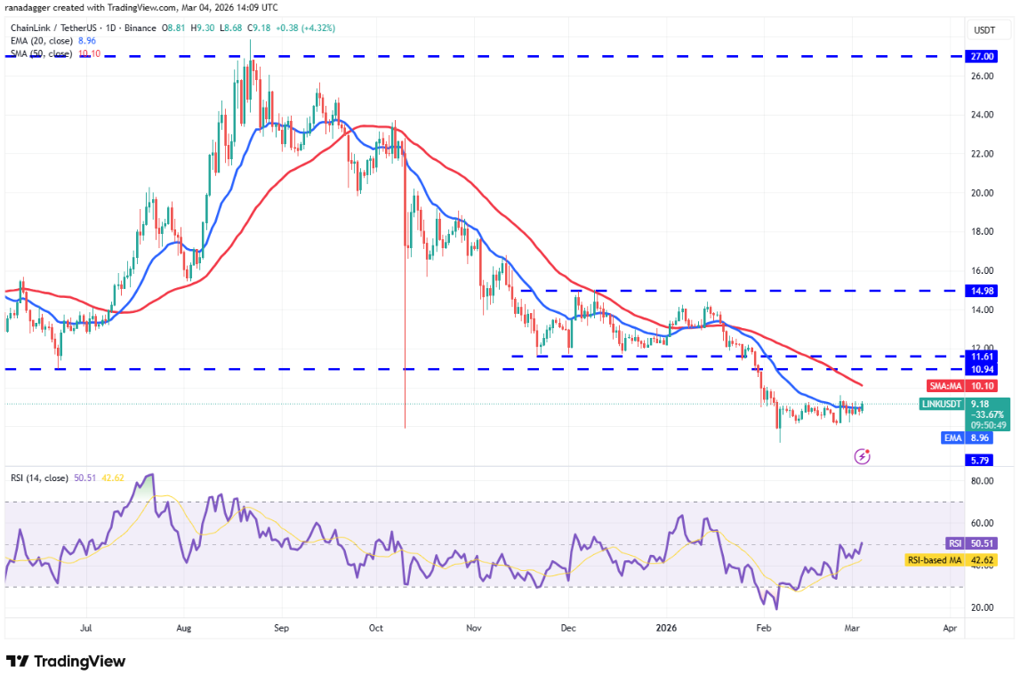 Chainlink (LINK) đã bám sát đường EMA 20 ngày ($8,96) trong vài ngày qua, cho thấy sự giằng co quyết liệt giữa phe bò và phe gấu.
