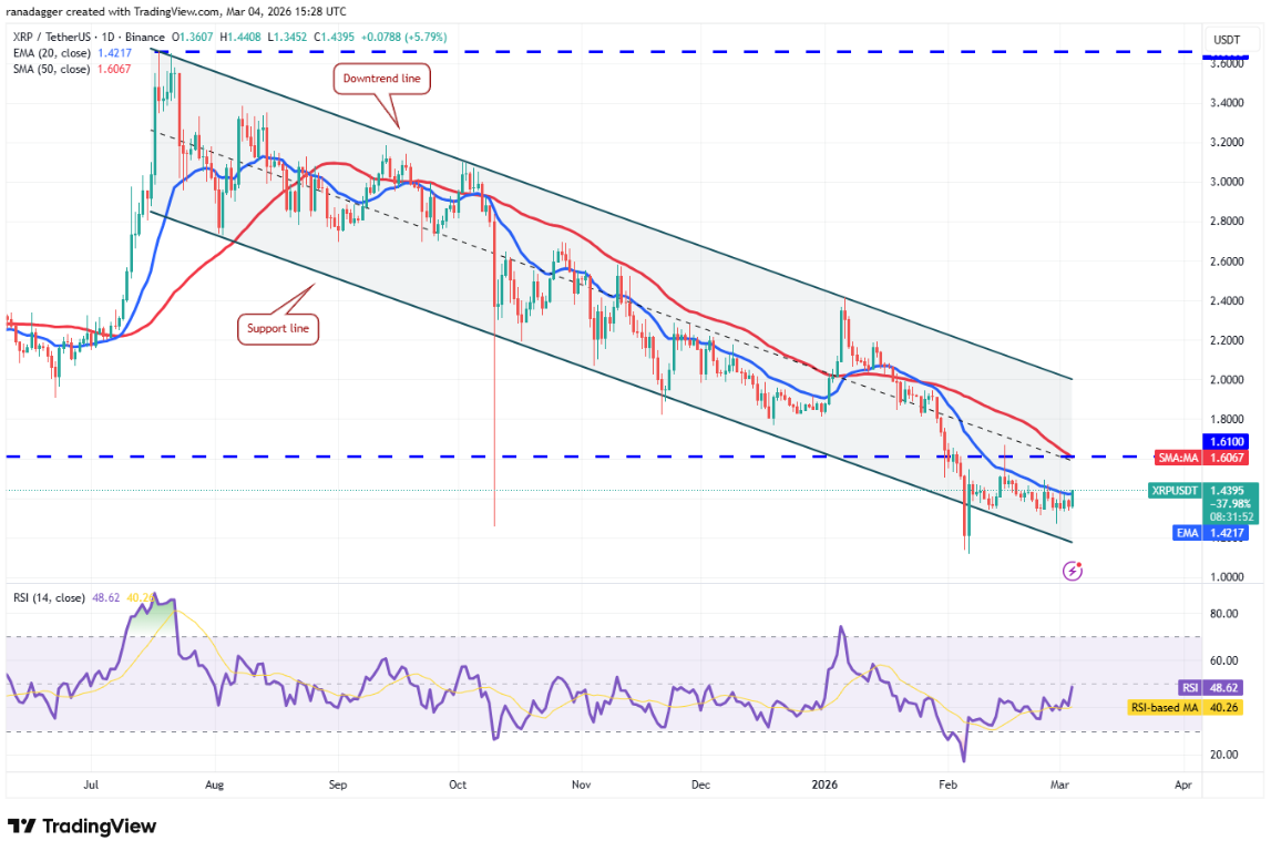XRP đã giao dịch gần đường EMA 20 ngày ($1,42) trong nhiều ngày, cho thấy phe bò vẫn duy trì áp lực.