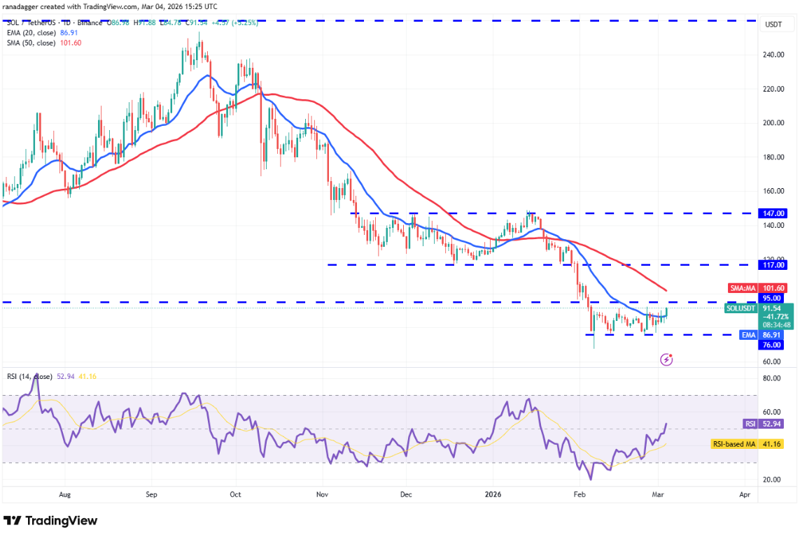 Đuờng EMA 20 ngày đang đi ngang ($86) và RSI nằm ngay trên mức trung bình, cho thấy áp lực bán đang giảm. Người mua sẽ cố đẩy giá vượt mốc $95. Nếu thành công, cặp SOL/USDT có thể tăng mạnh lên $117.
