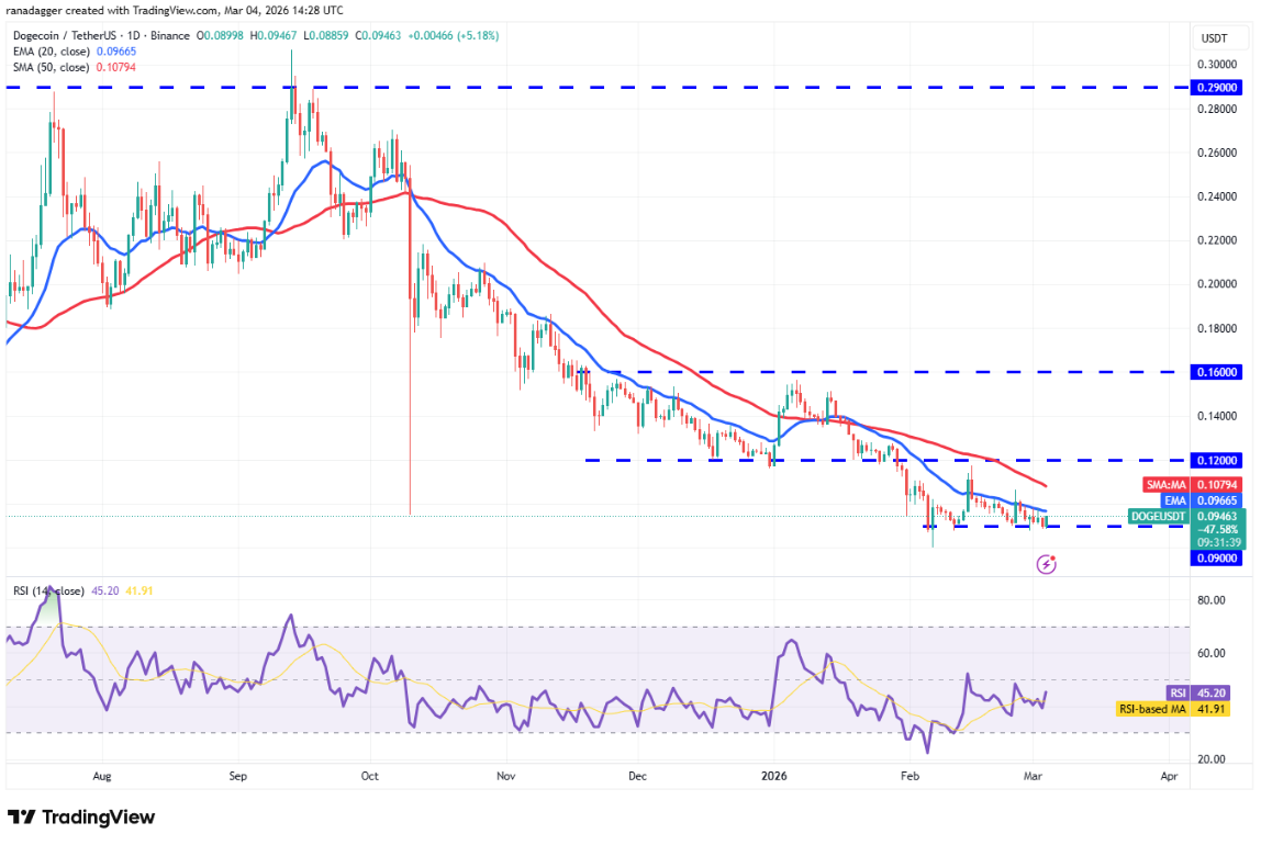 Việc phe bò không thể đẩy Dogecoin (DOGE) vượt lên trên EMA 20 ngày ($0,10) cho thấy phe gấu vẫn đang gây áp lực.