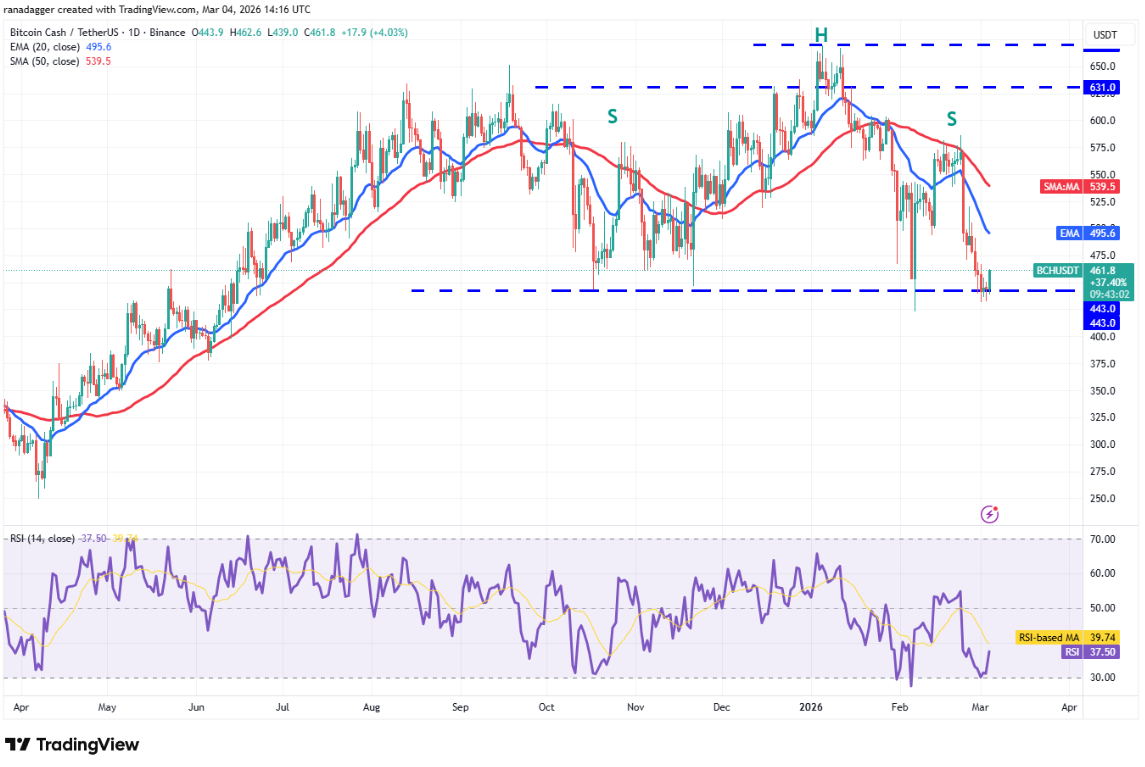 Phe bò đang cố gắng khởi động một đợt phục hồi kỹ thuật, nhưng nhiều khả năng sẽ gặp áp lực bán tại đường EMA 20 ngày ($495). Nếu giá Bitcoin Cash quay đầu giảm mạnh từ EMA 20 ngày, rủi ro phá vỡ hỗ trợ $443 sẽ gia tăng. Khi đó, cặp BCH/USDT sẽ hoàn tất mô hình vai đầu vai giảm giá, mở ra đà giảm về $375.
