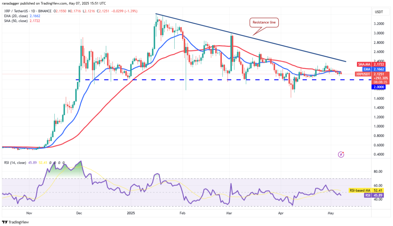 Đường trung bình đi ngang cùng với chỉ báo RSI dao động ngay dưới vùng trung lập cho thấy cặp XRP/USDT có thể tiếp tục đi ngang trong vùng giữa đường kháng cự và hỗ trợ $2 thêm một thời gian nữa.