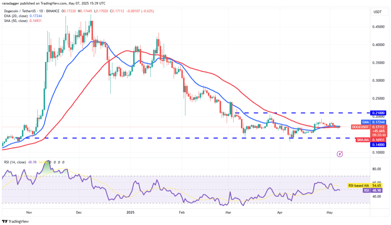 Nếu giá đóng cửa dưới các đường trung bình, phe gấu có thể đẩy cặp DOGE/USDT về ngưỡng hỗ trợ trong vùng $0,14. Trong kịch bản đó, phe bò sẽ cố gắng giữ giá trong phạm vi bằng cách mua vào quanh mốc $0,14.