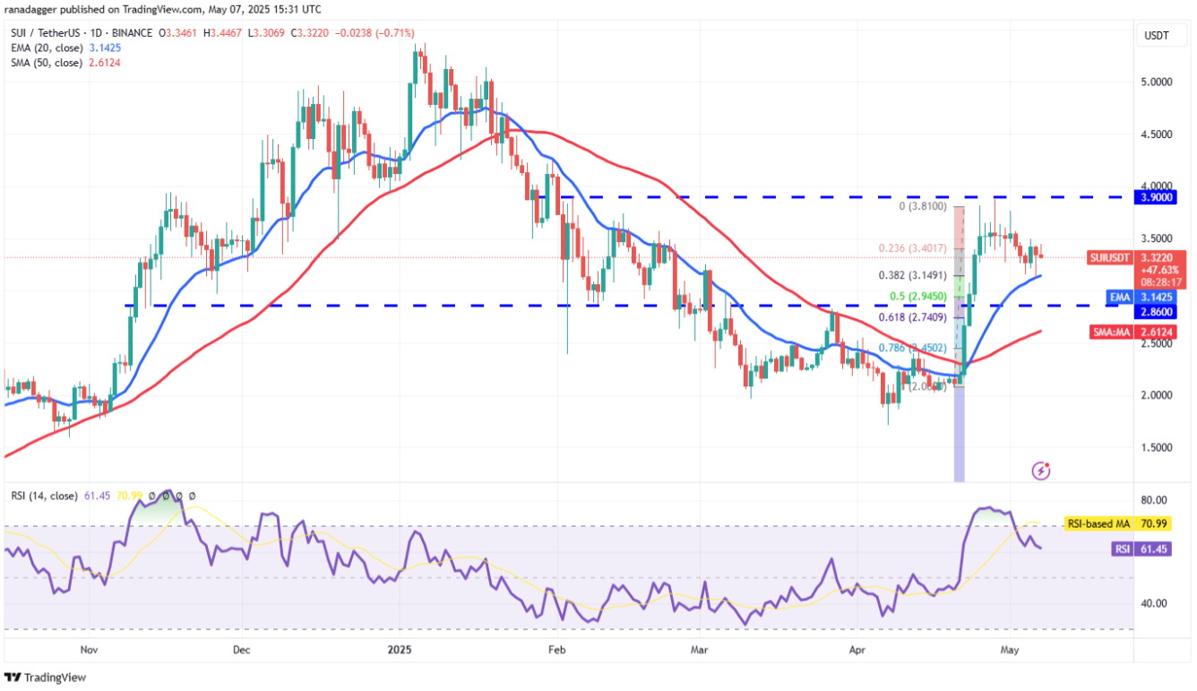 Sui (SUI) đã bật tăng từ đường EMA 20 ngày ($3,14) vào ngày 6 tháng 5, cho thấy các mức giá thấp đang thu hút lực mua.