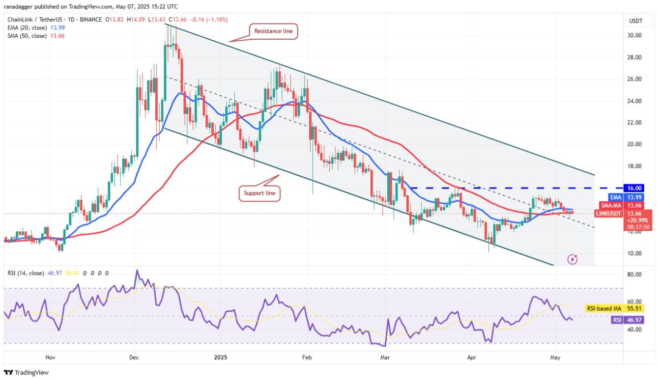 Nếu đường SMA 50 ngày bị xuyên thủng, cặp LINK/USDT có thể giảm sâu về $11,68. Phe bò có thể sẽ cố gắng bảo vệ vùng giá này, nhưng bất kỳ nhịp hồi phục nào cũng sẽ đối mặt với áp lực bán quanh các đường trung bình động. Nếu giá quay đầu giảm từ các đường trung bình, cặp tiền này có thể tiếp tục rơi về đường hỗ trợ của kênh giảm dần.