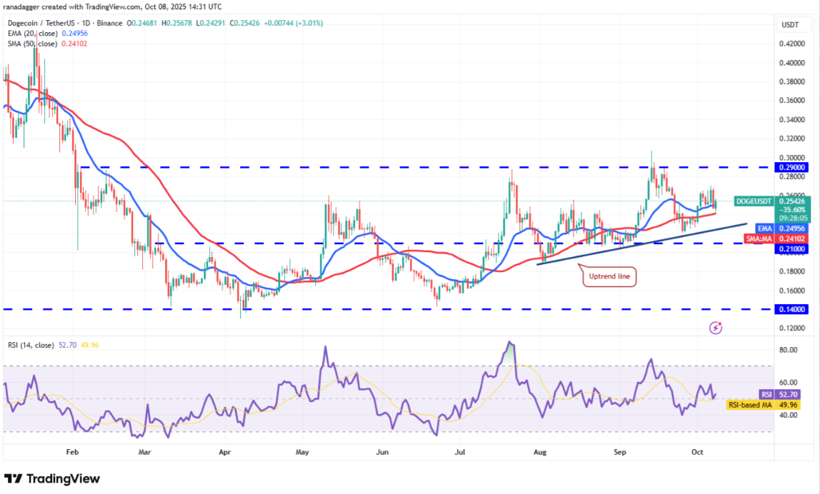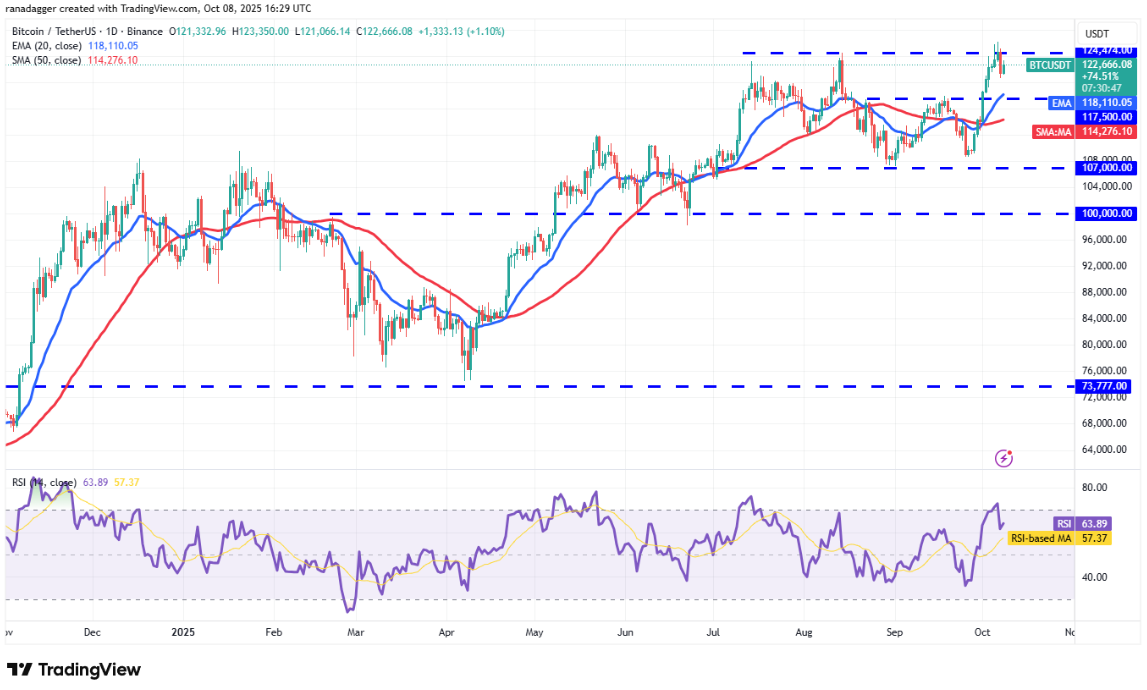 Cặp BTC/USDT quay đầu giảm và rơi xuống dưới ngưỡng đột phá 124.474 USD vào thứ Ba. Tuy nhiên, đường trung bình động hàm mũ 20 ngày (118.110 USD) đang hướng lên và chỉ số RSI vẫn nằm trong vùng tích cực — cho thấy lợi thế vẫn nghiêng về phe bò.