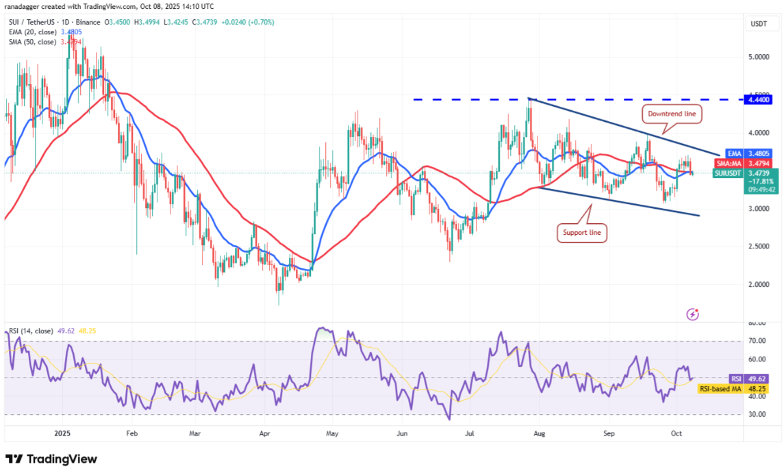 Đường EMA 20 ngày (3,48 USD) đi ngang cùng chỉ số RSI quanh vùng trung lập cho thấy cả hai phe đều chưa chiếm ưu thế rõ rệt. Nếu giá Sui trượt xuống dưới các đường trung bình động và duy trì ở đó, điểm dừng tiếp theo có thể là đường hỗ trợ.