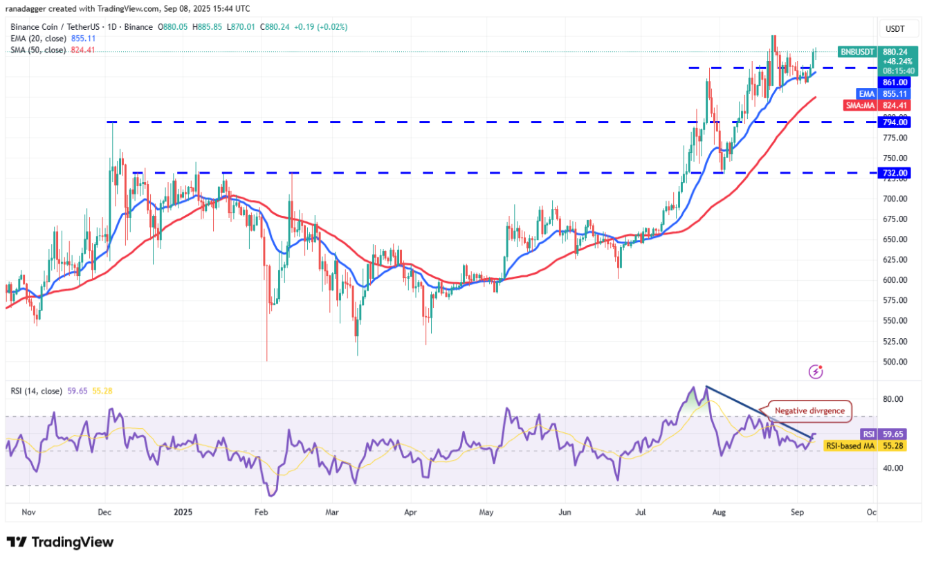 Đà tăng có thể hướng tới mốc 900 USD, nơi phe gấu được kỳ vọng sẽ thiết lập phòng thủ mạnh mẽ. Nếu giá quay đầu giảm từ 900 USD nhưng nhanh chóng phục hồi tại đường EMA 20 ngày (855 USD), điều đó cho thấy tâm lý tích cực. Kịch bản này sẽ củng cố khả năng bứt phá lên trên 900 USD, mở đường cho BNB/USDT tiến về 1.000 USD.