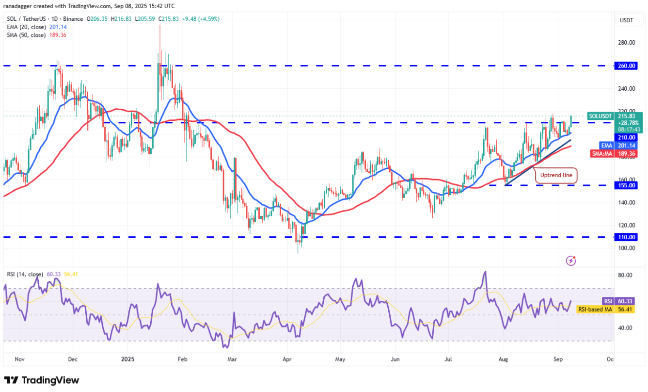 Solana (SOL) đã bật tăng từ đường EMA 20 ngày (201 USD) vào Chủ nhật, cho thấy phe bò vẫn kiên trì gom hàng khi giá điều chỉnh.