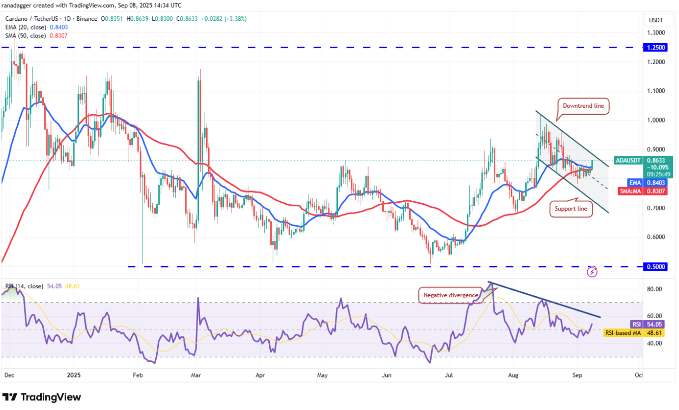 Cardano (ADA) bật lên trên các đường trung bình động vào thứ Hai và hiện tiến sát đường xu hướng giảm của kênh song song giảm dần, giao dịch ở mức 0,8692 USD.