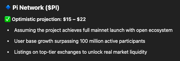 Với các ứng dụng trực quan và blockchain Layer-1 có khả năng mở rộng mạnh mẽ của Pi Network, quá trình áp dụng rộng rãi có thể diễn ra nhanh chóng. Nếu mọi thứ diễn ra thuận lợi, giá trị của PI có thể đạt $5 ngay cả khi không có một đợt tăng giá lớn trên toàn thị trường. Tuy nhiên, để đạt được điều này, ngành công nghiệp tiền điện tử sẽ cần sự rõ ràng về mặt quy định, đặc biệt là tại Hoa Kỳ, cùng với sự áp dụng rộng rãi của công nghệ blockchain để có thể tạo ra đợt tăng giá mạnh mẽ và đạt được các mục tiêu dài hạn.
