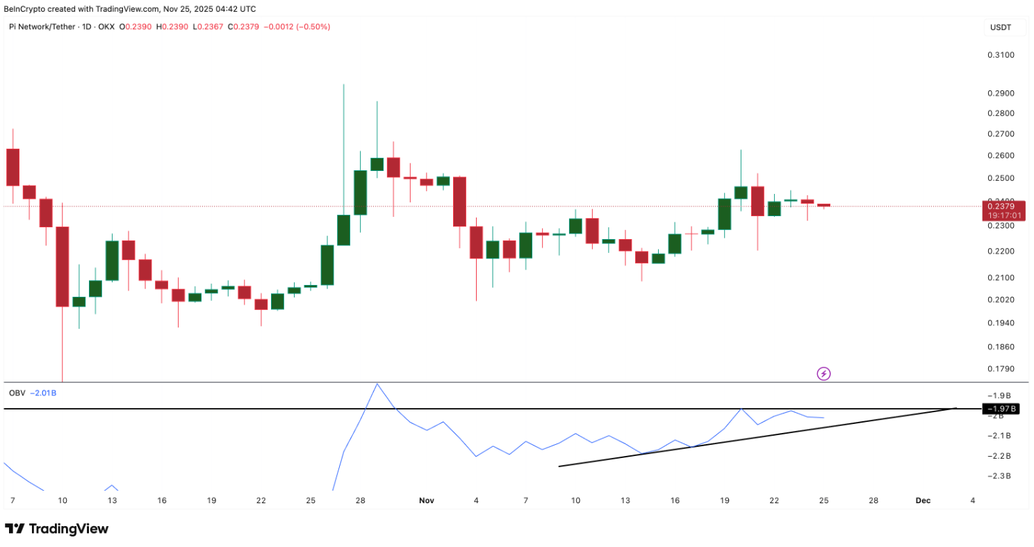 Khối lượng giao dịch cũng củng cố cảnh báo rủi ro tương tự. On-Balance Volume (OBV) vẫn chưa vượt qua đường xu hướng quan trọng gần mức –1,97 tỷ, cho thấy dòng tiền mới chưa đổ mạnh vào thị trường. Cho đến khi OBV phá vỡ đường xu hướng này, Pi Coin vẫn chưa đủ lực để bứt phá mạnh. Ngược lại, nếu OBV rơi xuống dưới đường xu hướng tăng, lực hỗ trợ từ khối lượng có thể suy yếu thêm.