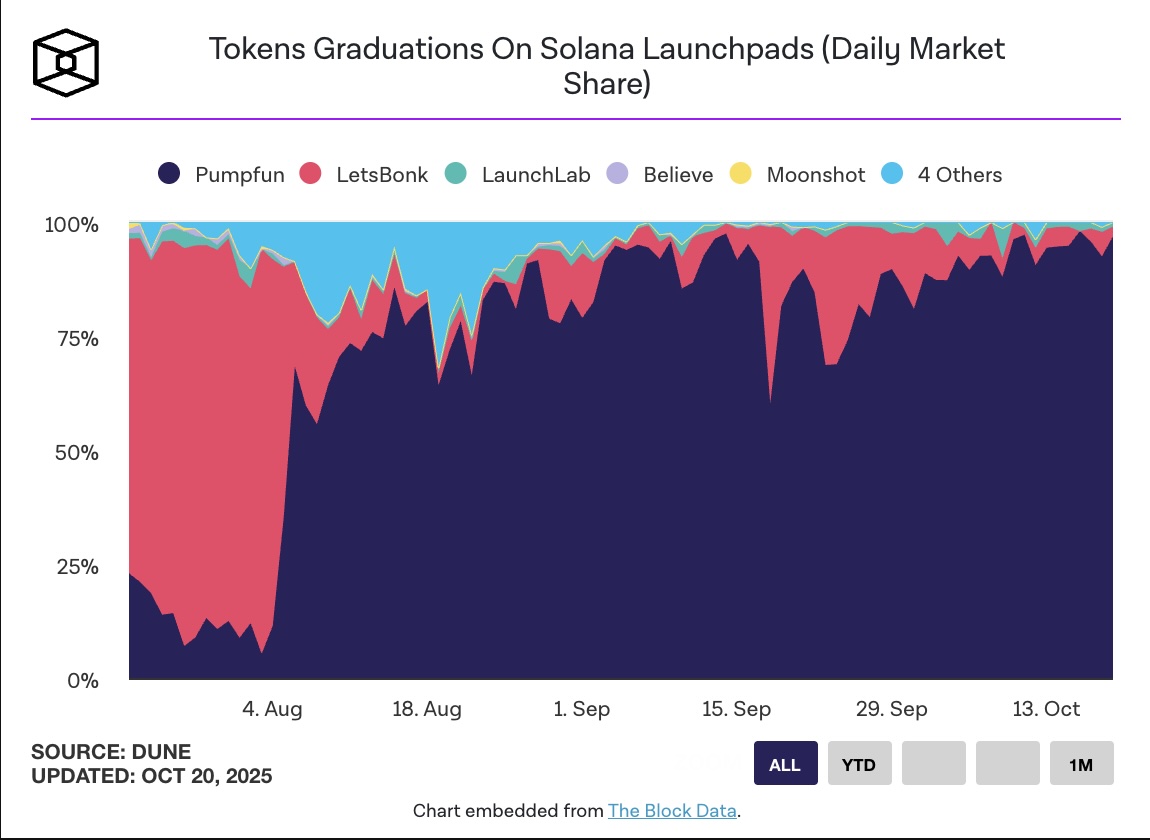 Nền tảng Pump.fun tiếp tục khẳng định vị thế dẫn đầu khi chiếm tới 95% thị phần “token graduation” hằng ngày, gần như tái lập thế độc quyền. Đây là bước phục hồi mạnh mẽ so với giai đoạn mùa hè vừa qua, khi các đối thủ như LetsBonk, Believe và Moonshot từng đồng loạt thách thức vị thế của nền tảng này.