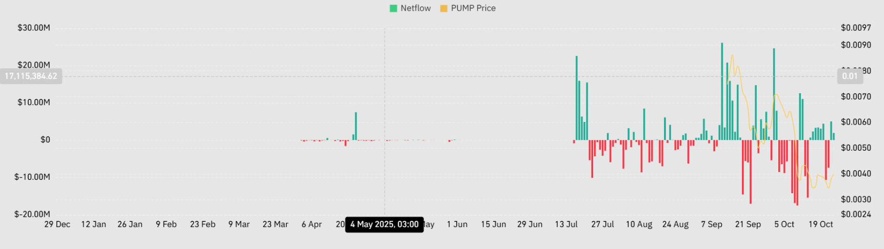 Sau khi giảm về vùng hỗ trợ 0,0034 USD, PUMP nhanh chóng thu hút sự chú ý của các nhà đầu tư lớn, những người đã đồng loạt nhập cuộc để bảo vệ mốc giá quan trọng này.