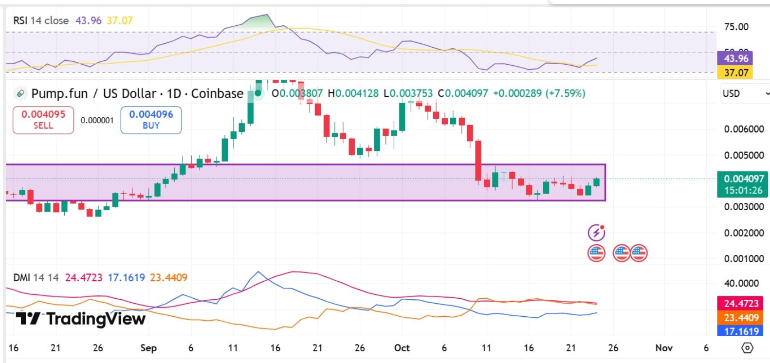 Kể từ sau cú sập ngày 11/10, Pump.fun (PUMP) vẫn loay hoay trong vùng giá hẹp, dao động quanh mốc 0,003 – 0,0045 USD. Tuy nhiên, tại thời điểm viết bài, PUMP đã bật tăng lên 0,0041 USD, ghi nhận mức tăng 10,3% chỉ trong 24 giờ.