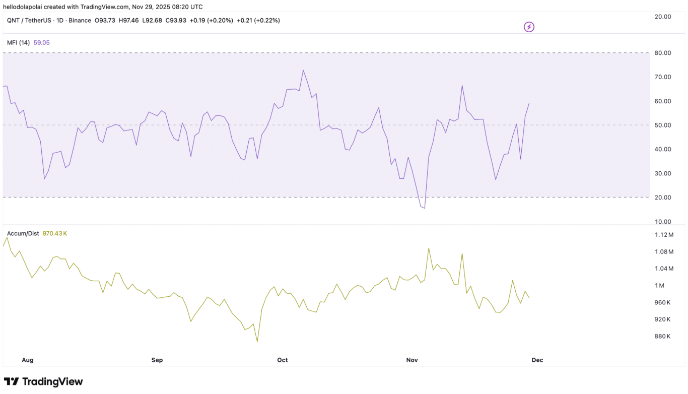 Tại thời điểm ghi nhận, QNT giao dịch quanh mốc 93 USD, tiến sát ngưỡng tâm lý 100 USD. Tuy nhiên, một số chỉ báo tâm lý khác vẫn phát đi tín hiệu thận trọng, cho thấy khả năng chinh phục mốc giá này có thể không hề dễ dàng.
