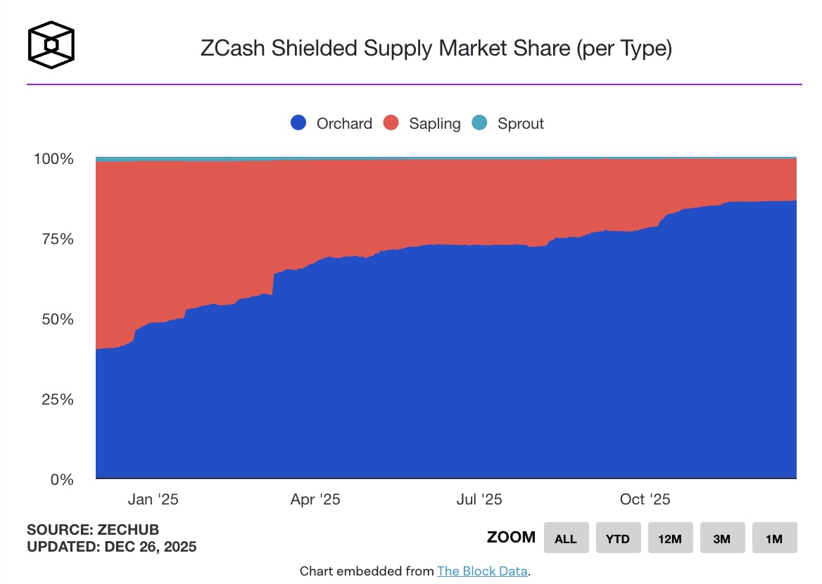 Thị phần nguồn cung được bảo mật của Zcash duy trì ổn định quanh mức 23%, sau khi tăng mạnh từ khoảng 8% vào đầu năm 2025. Dù làn sóng chú ý quanh token ZEC đã hạ nhiệt, các chỉ số cho thấy mức độ chấp nhận công nghệ bảo mật không suy giảm mà đang đi vào trạng thái ổn định, phản ánh nhu cầu bền vững đối với các giao dịch bảo toàn quyền riêng tư.
