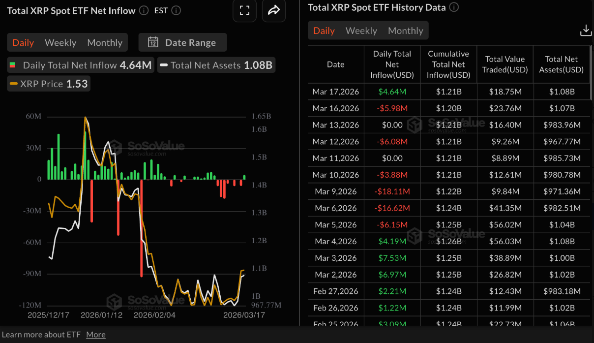 Các quỹ XRP ETF giao ngay đã thu hút trở lại dòng vốn trong phiên thứ Ba sau chuỗi 8 ngày giao dịch trầm lắng. Dữ liệu từ SoSoValue cho thấy dòng tiền vào đạt 4,6 triệu USD, đảo chiều tích cực so với mức rút ròng gần 6 triệu USD ghi nhận trong phiên trước đó.