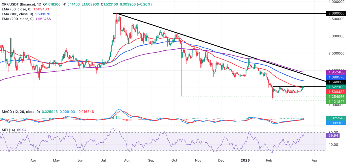 Dù vậy, áp lực từ đường xu hướng giảm dài hạn — vốn đã kìm hãm mọi nỗ lực phục hồi kể từ đỉnh lịch sử 3,66 USD — vẫn chưa bị phá vỡ, qua đó duy trì cấu trúc giảm chủ đạo của thị trường, bất chấp đà tăng gần đây.
