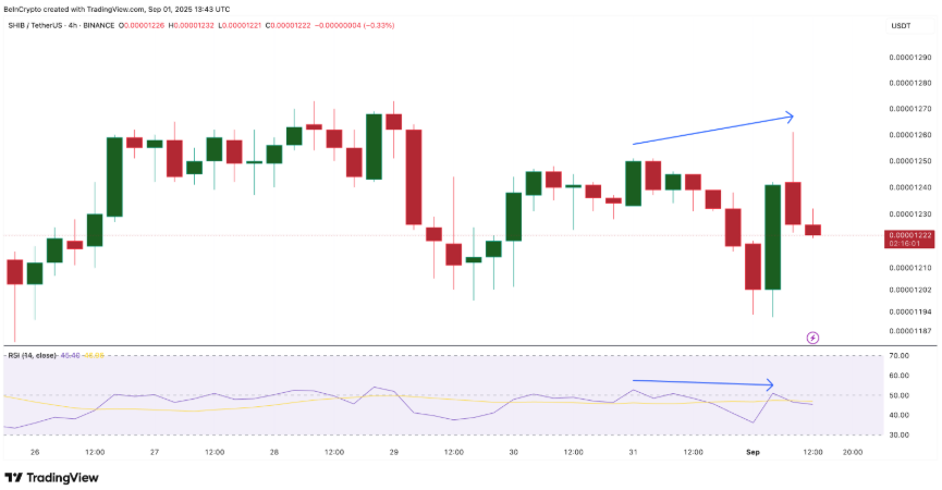 Biểu đồ 4 giờ hiện cho thấy tín hiệu phân kỳ giảm, trong đó giá SHIB tạo đỉnh cao hơn trong khi chỉ báo RSI ghi nhận đỉnh thấp hơn.