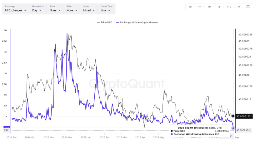 Thông thường, việc rút tiền khỏi các sàn giao dịch tăng lên cho thấy nhà đầu tư đang chuyển token sang lưu trữ dài hạn. Tuy nhiên, thay vì xem xét dòng tiền chảy ra, số lượng địa chỉ rút SHIB khỏi sàn (Exchange Withdrawing Addresses) sẽ tính số lượng địa chỉ duy nhất thực hiện rút tiền.
