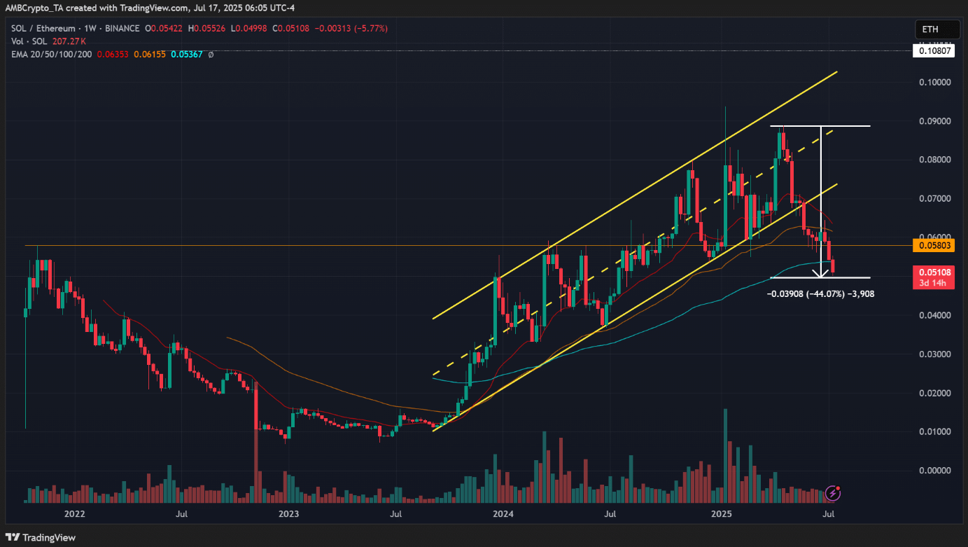 Trái ngược với đà tăng trưởng gần đây, tỷ lệ SOL/ETH lại vẽ nên một bức tranh u ám hơn. Kể từ tháng 4, SOL đã tụt hậu so với ETH tới hơn 44%, đồng thời đánh mất xu hướng tăng giá khi phá vỡ xuống dưới kênh sóng song tăng dần trong chu kỳ này.