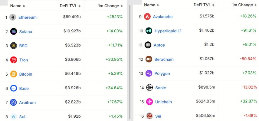 Những diễn biến đáng chú ý trên Solana bao gồm mức tăng 48% trong tiền gửi của Raydium và tăng 28% trong TVL của Marinade. Tuy nhiên, các ứng dụng phi tập trung khác (DApp) như Jupiter, Kamino và Drift ghi nhận đà tăng khiêm tốn hơn.