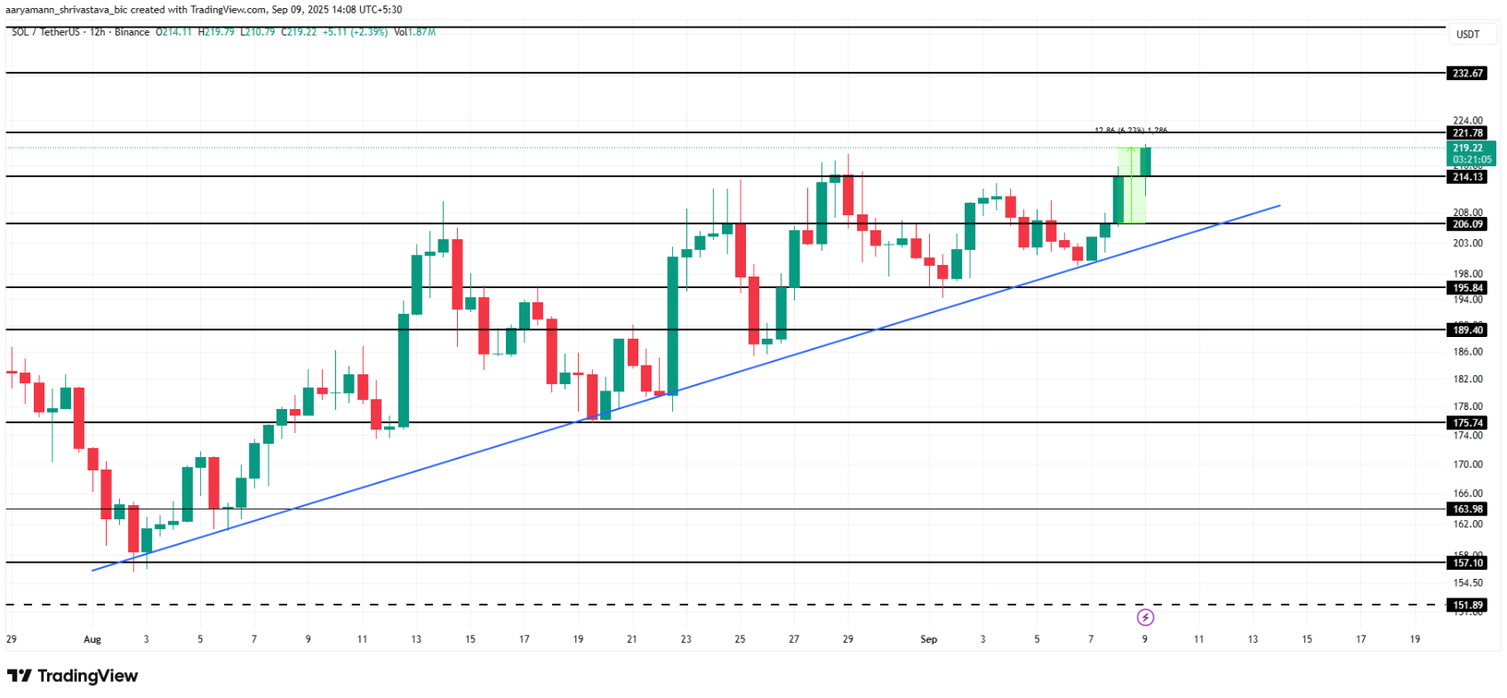 Tại thời điểm viết bài, Solana đang giao dịch quanh mốc 219 USD, vững vàng trên ngưỡng hỗ trợ 214 USD. Đây là mức giá cao nhất trong bảy tháng qua, với SOL đang chạm phải kháng cự mạnh tại 221 USD. Việc giữ vững ngưỡng này sẽ đóng vai trò then chốt, định hình hướng đi ngắn hạn của đồng coin này.